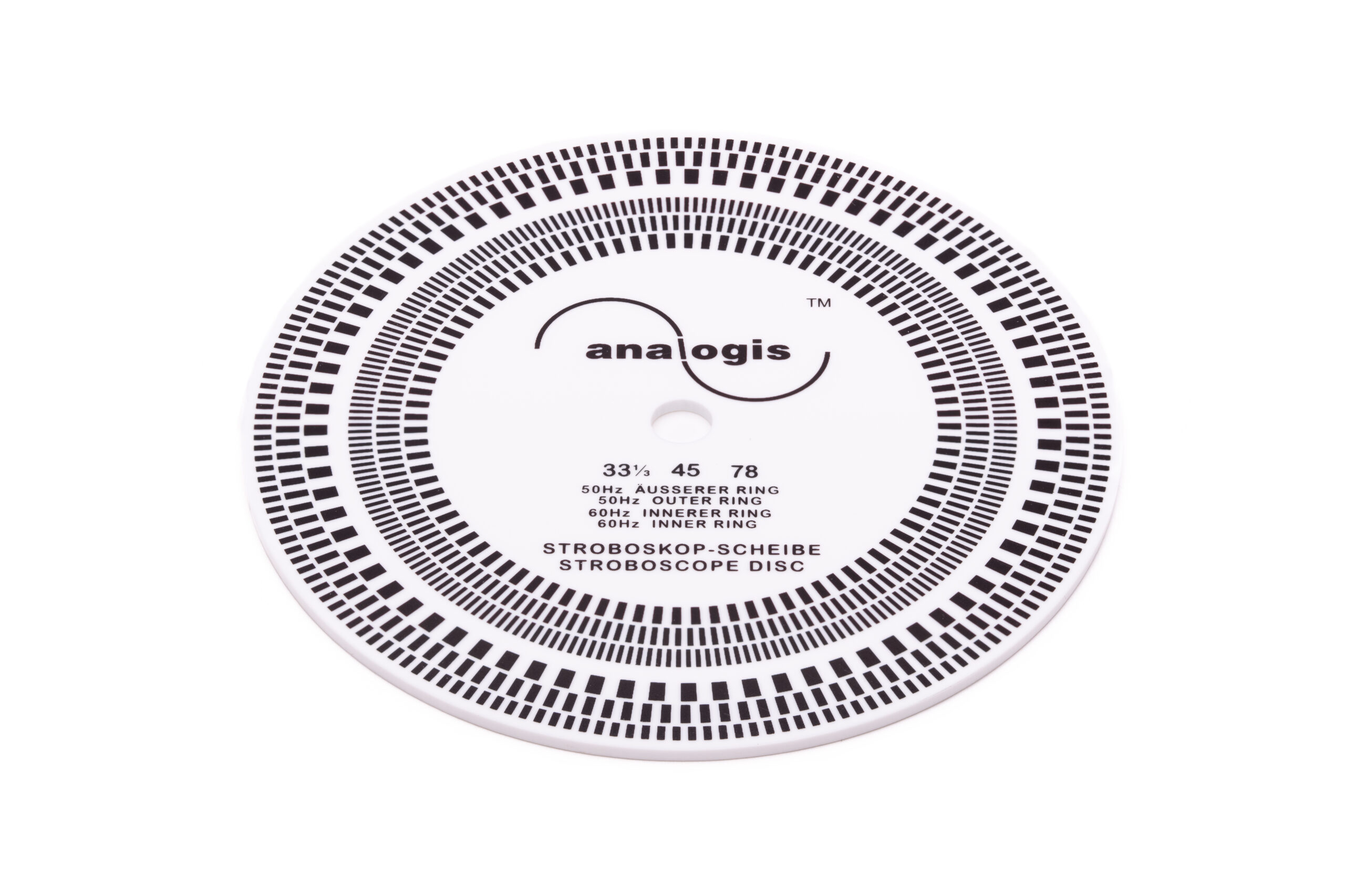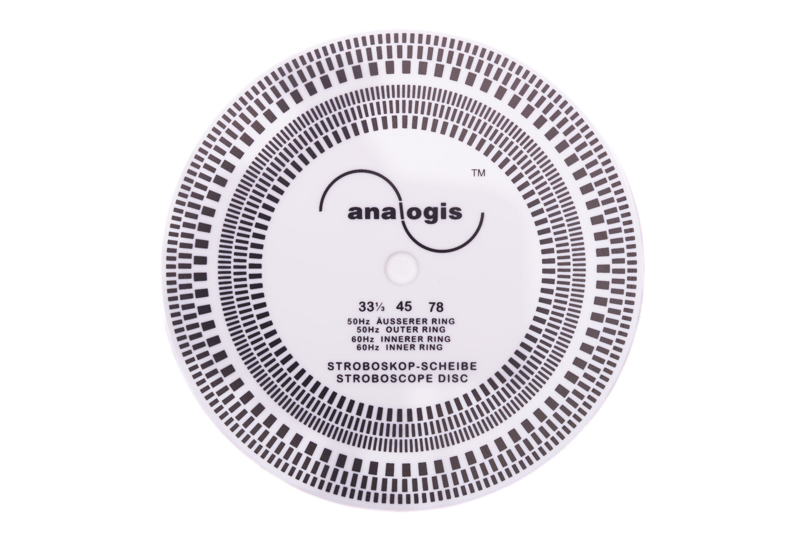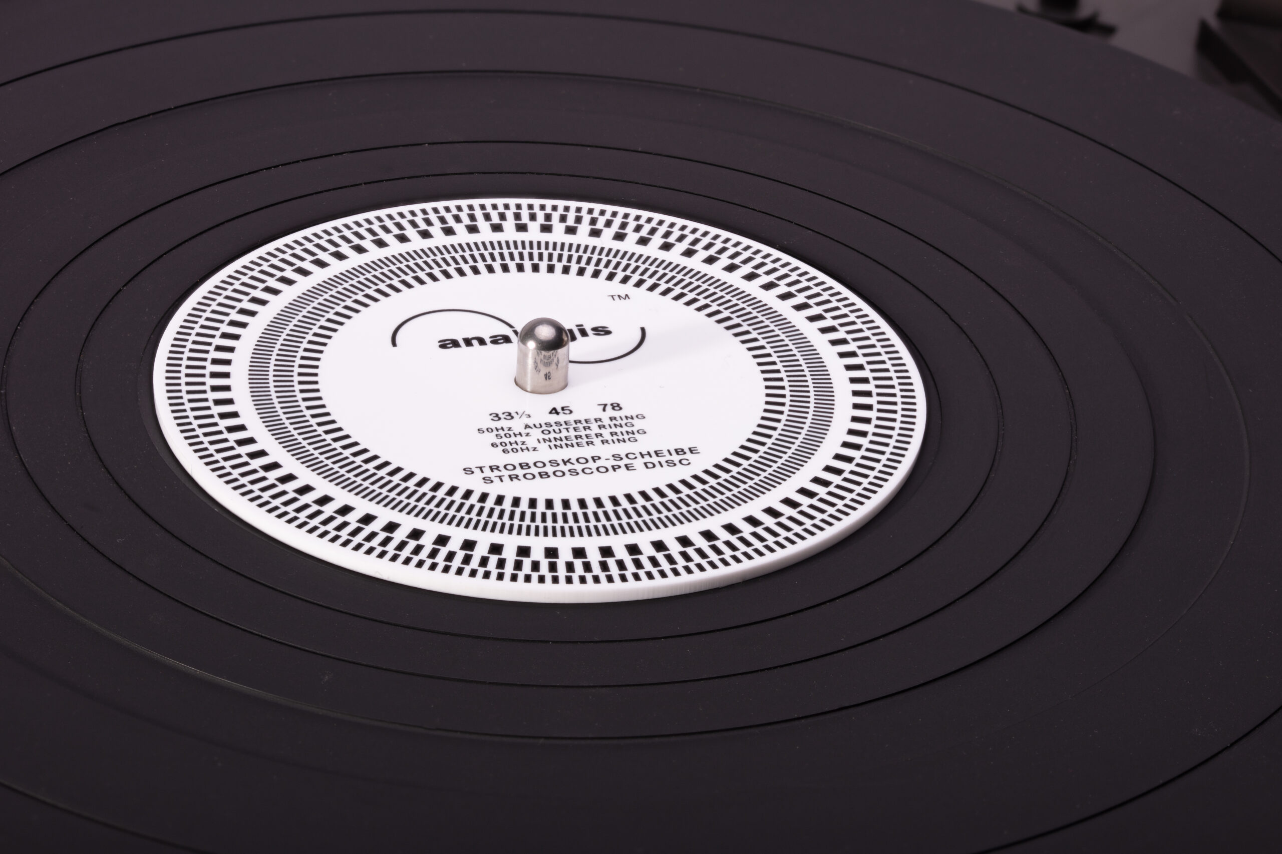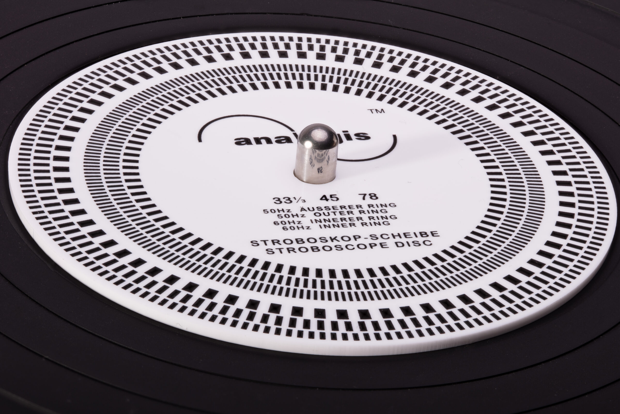 Auf dieser Scheibe befinden sich gepunktete/unterbrochene Kreise. Die Geschwindigkeiten 33 ⅓, 45 und 78 Umdrehungen pro Minute (UpM) können bei 50 Hz-Licht mit den drei äußeren Ringen gemessen werden. Es fängt ganz außen mit 33 ⅓ UpM an, gefolgt von 45 UpM um mit 78 UpM zu enden.