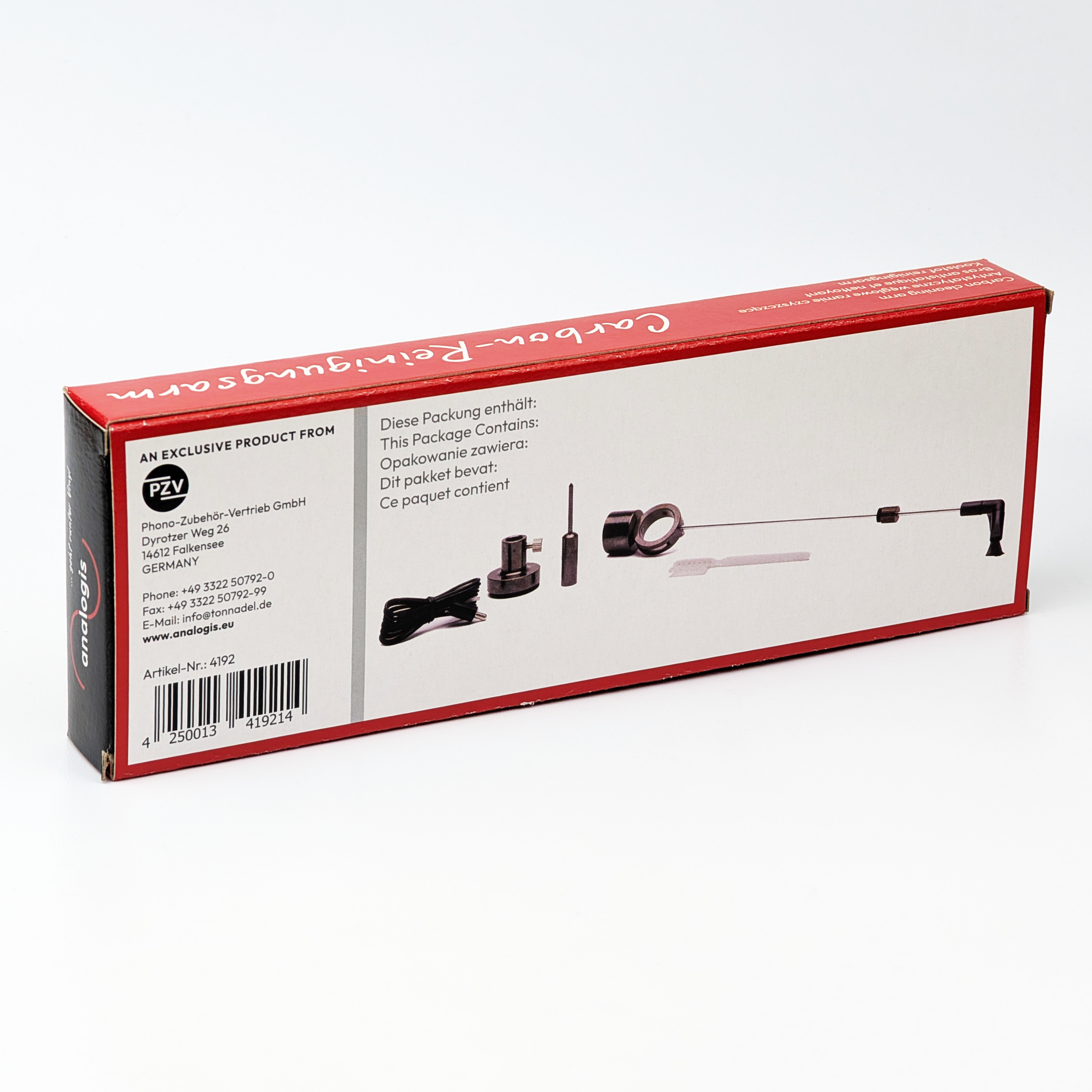 The fine fibers of the carbon cleaning brush penetrate deep into the grooves of the record and effectively remove dirt and dust. The analogis cleaning arm is pivot-mounted, resulting in minimal friction. The arm reacts almost weightlessly to the necessary rotational movement during the cleaning process.