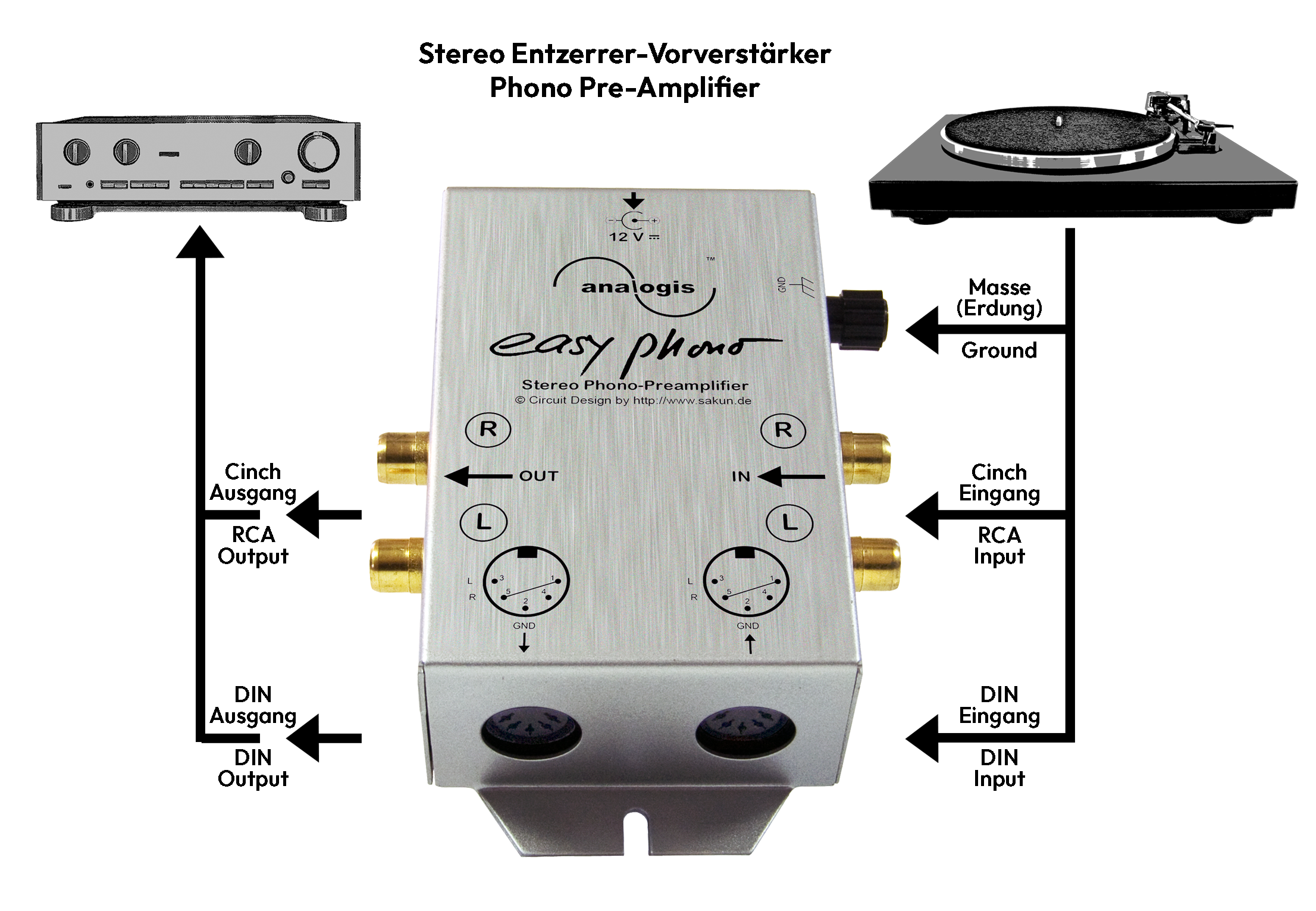 Dieses Gerät ermöglicht, einen Plattenspieler mit Magnettonabnehmer an eine Stereoanlage ohne speziellen Phono-Eingang anzuschließen. Der Vorverstärker sorgt für eine optimale Pegelanpassung und Entzerrung der auf der Schallplatte vorhandenen Musiksignale. Das Gerät besitzt Cinch- und DIN-Anschlüsse für alle anfallenden Steckernormen. Auch für historische, dreipolige DIN-Stecker geeignet! Sollte es beim Anschluss eines Plattenspielers mit Cinch- Steckern und zusätzlicher Erdungsleitung zu einem Brummton kommen, schließen Sie bitte das Erdungskabel an die mit „GND“ bezeichnete Masse-/Erdungsschraube des Easy-Phono an.