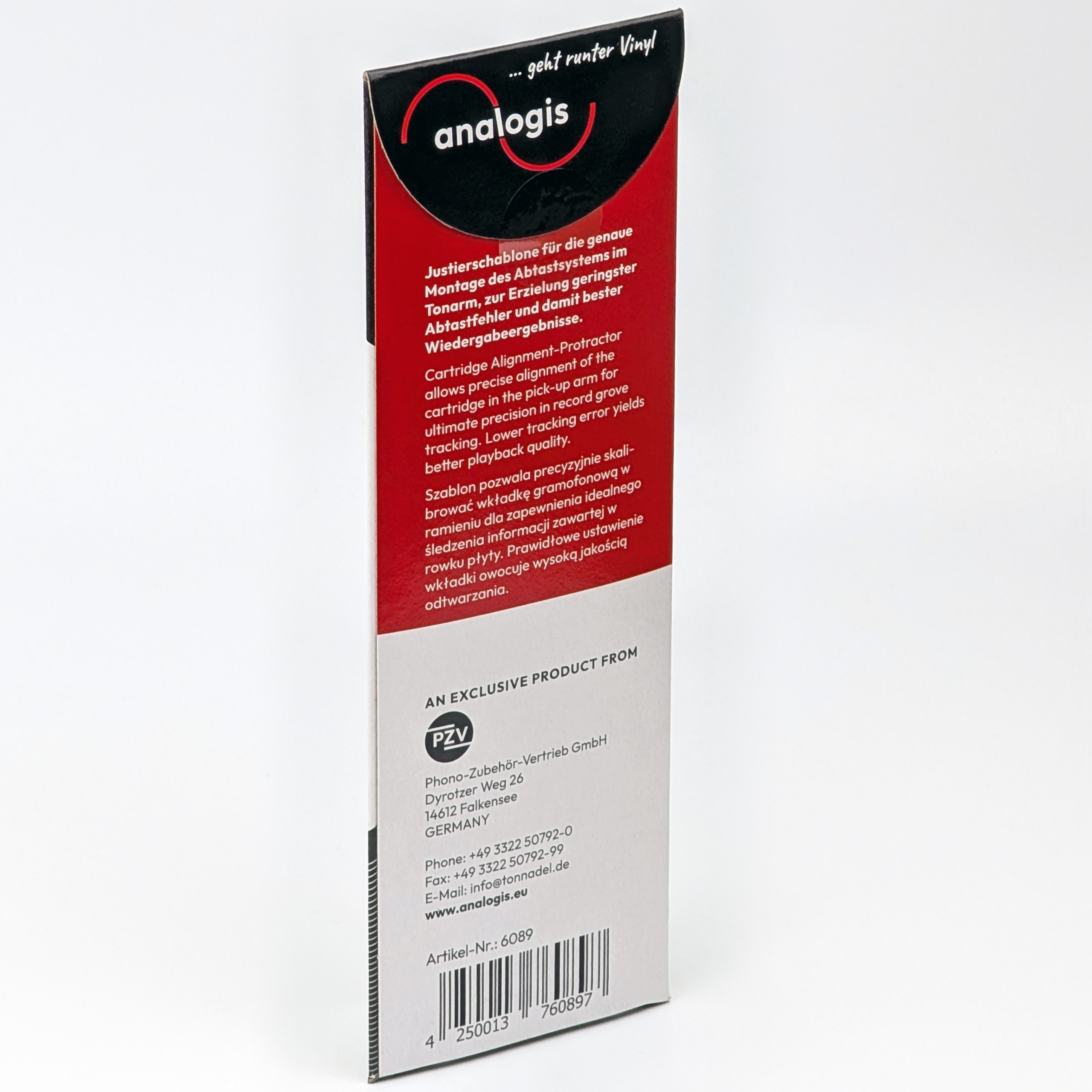 Alignment protractor for the precise mounting of the cartridge in the tonearm, to achieve minimal tracking error and thus the best playback results.