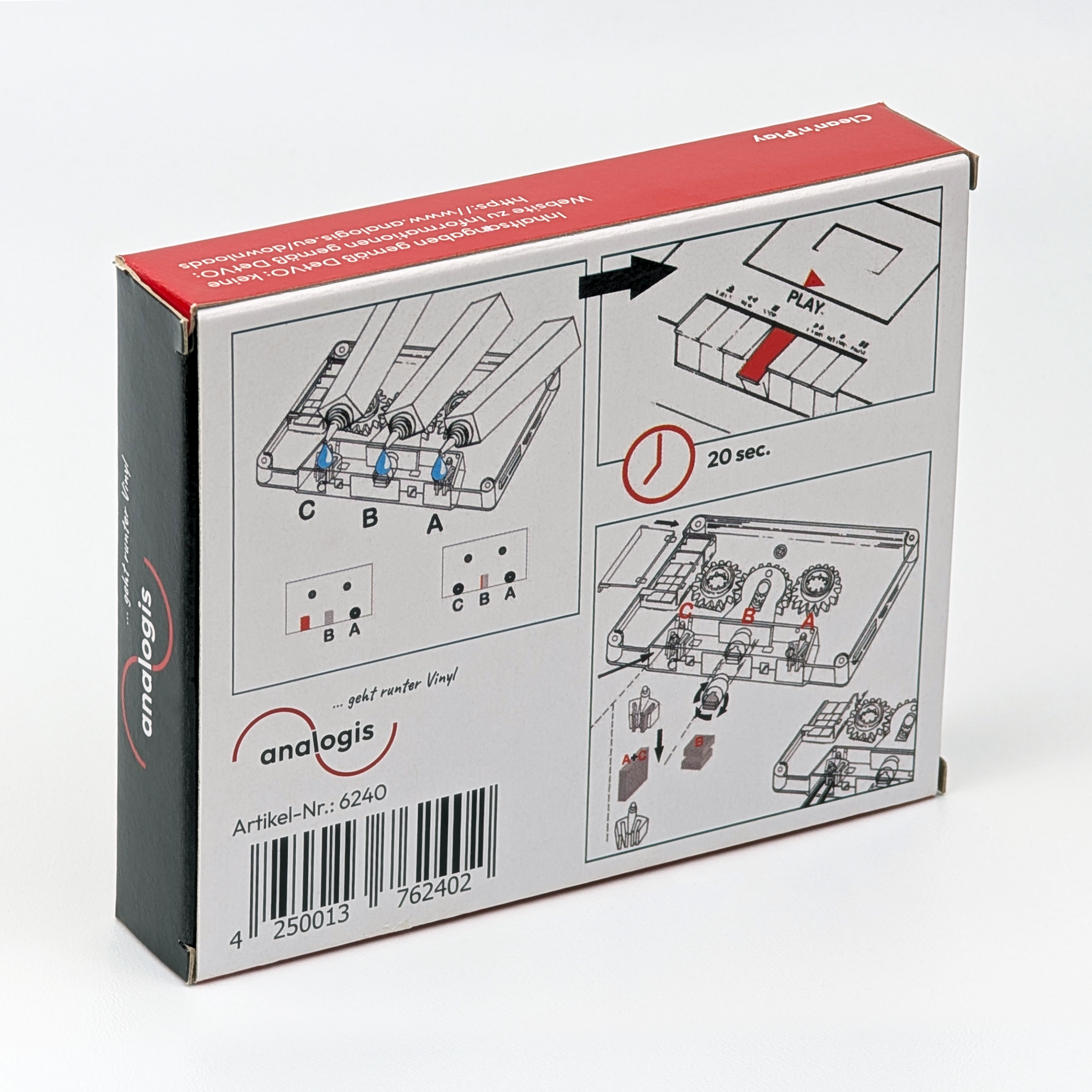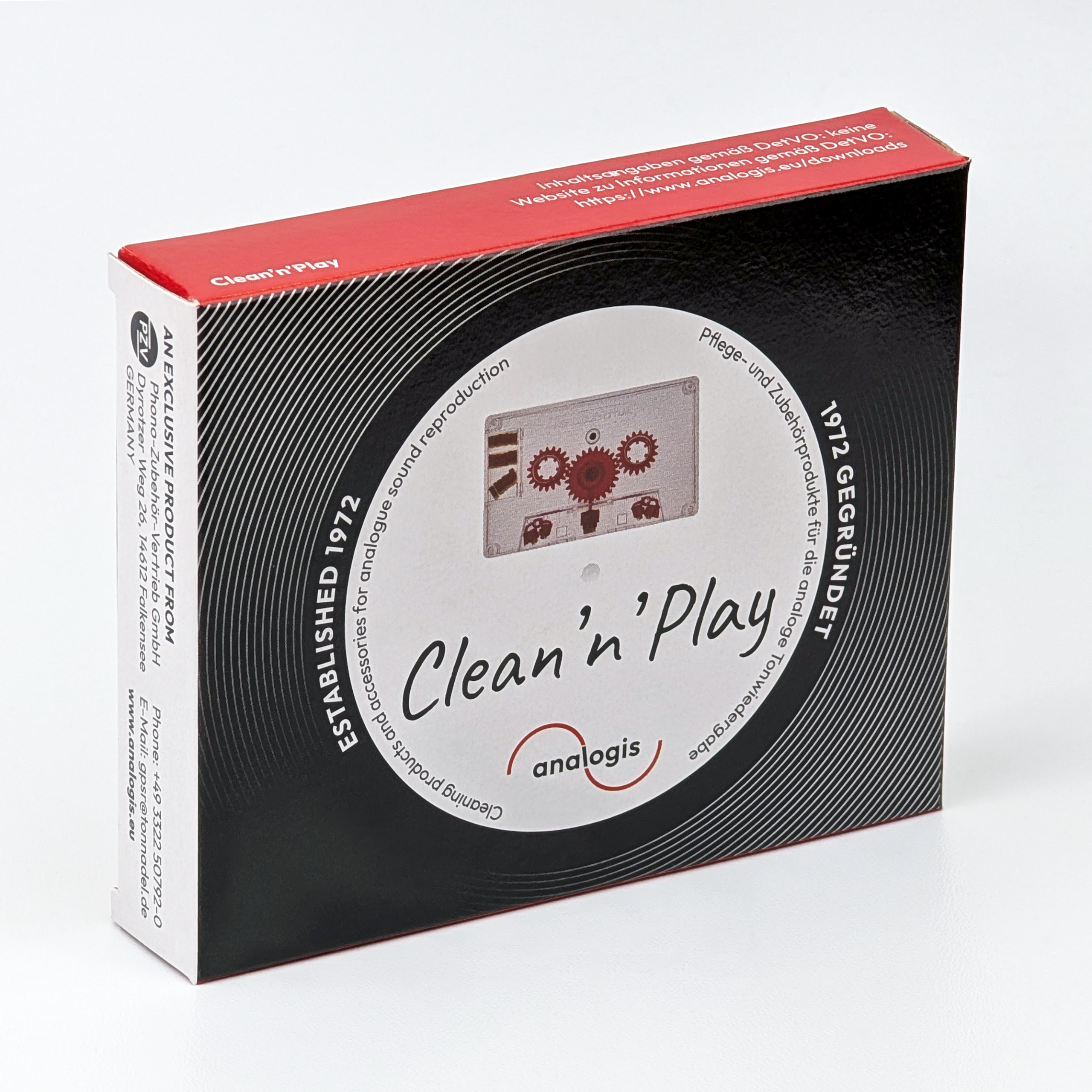 In the analogis “Clean ’n’ Play” MC automatic cleaning cassette, an intelligent mechanism gently removes dirt not only from the tape heads but also from the pinch roller and capstan shaft. Even cassette decks with dual-capstan tape transport are cleaned. The soft cleaning felts (replacement felts are included) are lightly moistened with the accompanying cleaning fluid, and the analogis “Clean ’n’ Play” MC automatic cleaning cassette is ready to use. Cleaning takes place in the cassette deck’s “play” mode. After just a few seconds, everything is spotlessly clean.